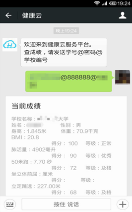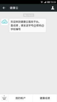 微信查询:关注健康云公众平台:cshjiankangyun,按照格式“学号@密码@学校编号”发送信息,即可查询健康测试成绩。