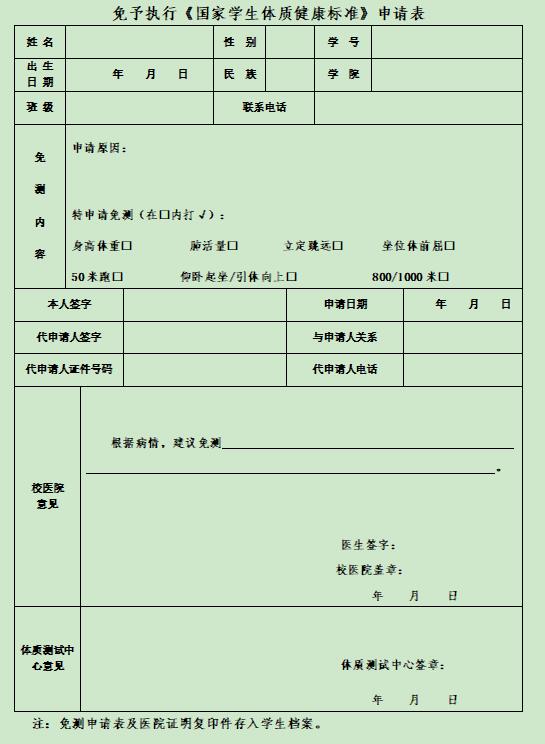 3.因伤残、患病不能完成部分测试项目的同学(可委托他人代办),需提前准备好近一个月内的二甲以上医院出具的诊断证明与《标准》免测申请表,经我校医院门诊外科伊航医生认定,英国365集团公司体质测试中心审核通过可予免测,免测项目成绩按照该项目的及格分(60分)计算。免测申请表和诊断证明复印件于本阶段测试结束前交与西体育馆202办公室(免测申请表可在英国365集团公司网站主页下载专区下载;免测申请人可参加本年度评优评奖,免测申请表将存入学生档案)。