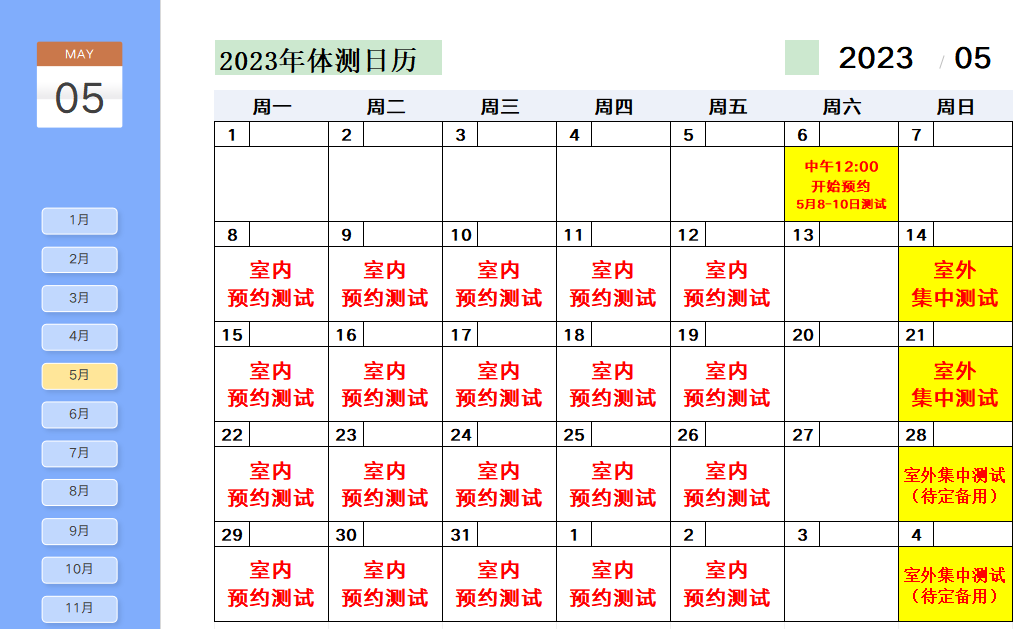 1.室内预约测试:2023年4月3日至6月2日,风雨无阻。具体预约测试日期见日程安排表。