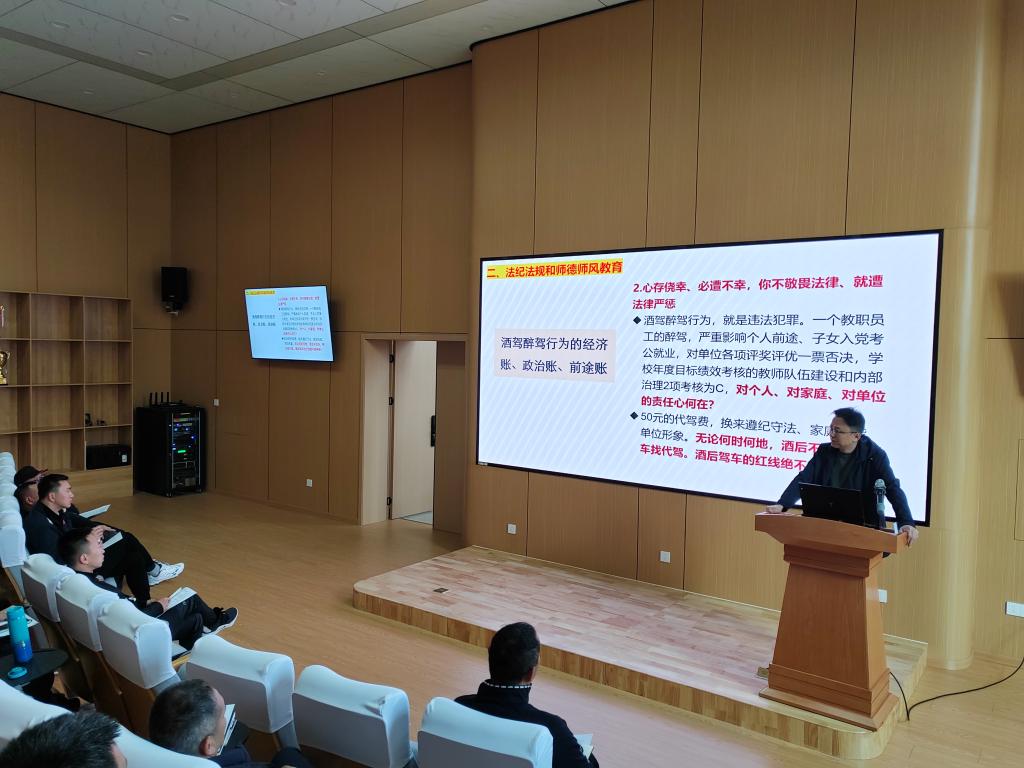 部党总支书记、陈国顺作会议总结。他通报了2023年度党员民主评议优秀结果,就2024年部党建重点工作进行部署。针对酒驾醉驾问题,重点开展法纪法规和师德师风教育。他强调,要算好酒驾醉驾行为的经济账、政治账、前途账,“心存侥幸、必遭不幸,你不敬畏法律、就遭法律严惩”;要牢牢守住法纪法规红线、师德师风底线,为人师表、行为示范,育人者先育己、立德树人者先有德。