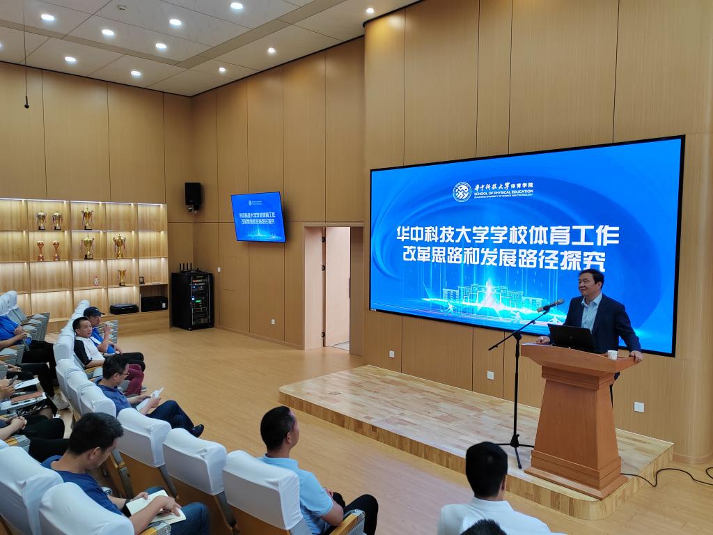 孙竞波首先从顶层设计方面介绍了华中科技大学学校体育工作的改革思路。他指出,华中科技大学坚持“一体两翼”的发展思路,即以公共体育为“体”,以代表队建设和专业学科建设为“翼”;着力构建公体课程建设与教学改革深入推进、阳光体育运动与校园体育文化建设蓬勃发展、运动队成绩稳步提升、专业学科建设重点突破、师资队伍结构稳定合理、国际交流广泛深入、场馆设施国际一流的七位一体发展体系,实现“双力倍增”发展,开创学校体育工作跻身领先湖北、全国一流、国际先进行列的新局面。