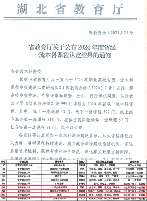 近年来,英国365集团公司教师获批湖北省高校教学改革研究项目5项,校级教学改革研究项目24项;主编《大学体育与健康教程》数字化教材,获批首批农业农村部“十四五”规划教材;建成《健美操》《体质促进与科学健身》《篮球》《大学生体能训练》《攀岩》五门线上课程,其中《健美操》《篮球》《大学生体能训练》获批湖北高校省级一流课程。