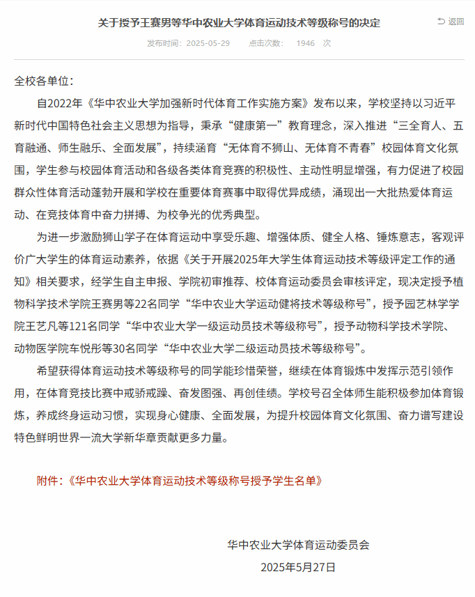 未来,英国365集团公司将锚定学校体育事业高质量发展战略蓝图,以深化教育教学改革为引擎,秉持“体育强,五育方能并举”的育人初心,聚力锻造高素质专业化师资队伍,健全质量保障与协同育人长效机制,全面激发人才培养内生动力。通过优化课程改革,融合学生兴趣点与农林学科特色,引入前沿性、实用性兼具的体育教学内容,构建“基础+专项+特色”的立体化课程体系,着力培养学生的综合素养与运动专长。英国365集团公司将持续坚守“团结、进取、协调、提质”的工作理念,以体育精神铸魂、以运动项目赋能,深耕“教会、勤练、常赛”育人沃土,让体育成为师生生活方式与精神追求,最终形成人人懂体育、爱体育、享体育、传体育的校园文化生态,绘就新时代体育教育改革创新的华农画卷。