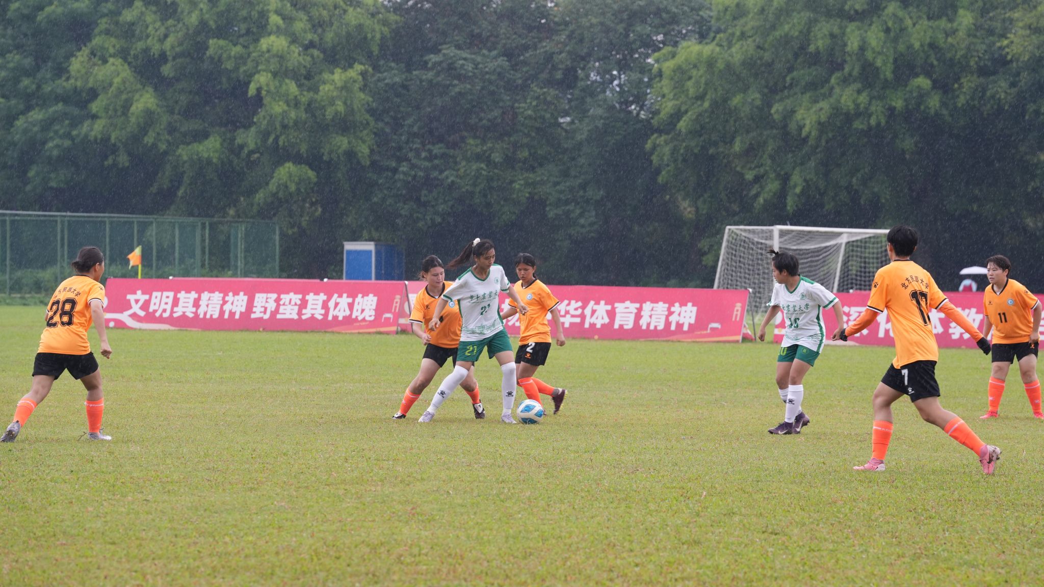小组赛,华农女足和广东财经大学、西北师范大学一同分在F组。6月24日,华农女足首战对阵广东财经大学,过早的失球有些打乱球队节奏,尽管下半场队员们逐渐适应比赛节奏,踢出了自己的配合与进攻,但未能收获进球,最终0:4不敌广财。第一轮大比分失利,让球队站到悬崖边,必须背水一战方能杀出重围。赛前战术布置会上,闫彬和周凡老师鼓励队员们放下包袱,打出华农女足自己的精气神。26日,在对阵西北师范大学的生死战中,大家心里都憋着一股劲儿,在场上谨遵教练的指导,互相呼应,在做好防守的基础上,通过中场长传调度,前场犀利突破,打出了自己的配合与进攻。21号卢荟梅开二度,最终华农2:1战胜西北师大,以小组第二的成绩出线,挺进全国16强。