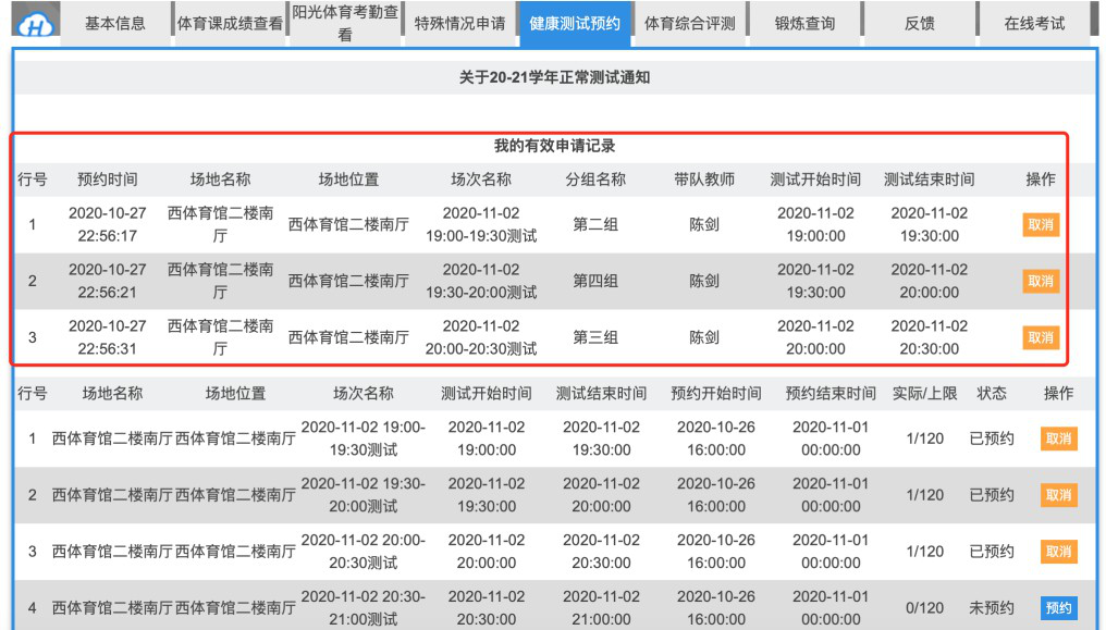 2.请同学们规划好时间,务必在室内预约时间和室外集中规定时间内完成测试。每位同学可预约3次,预约的测试时间过后方可预约下一次测试。