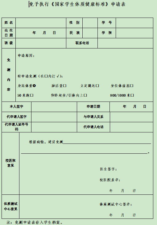 3.因伤残、患病不能完成部分测试项目的同学(可委托他人代办),需提前准备好近一个月内的正规医院盖章诊断证明与《标准》免测申请表,经校医院门诊外科医生认定,可免测部分项目,免测项目成绩按照男、女生该项目成绩的95%位置值给分。免测申请表于本年度测试结束前交于西体育馆205办公室(免测申请表可在英国365集团公司网站主页下载专区下载;免测申请人不需在健康云作免测申请;免测申请表将存入学生档案)。
