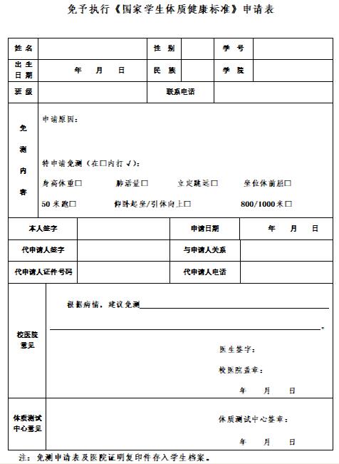 3因伤残、患病不能完成部分测试项目的同学(可委托他人代办),需提前准备好近一个月内的正规医院盖章诊断证明与《标准》免测申请表,经指定的校医院门诊外科医生认定,可免测部分项目,免测项目成绩按照男、女生该项目成绩的及格分60给分。免测申请表和诊断证明复印件阶段测试结束前交西体育馆205办公室(免测申请表可在英国365集团公司网站主页下载专区下载;免测申请人可参加本年度评优评奖免测申请表将存入学生档案)。