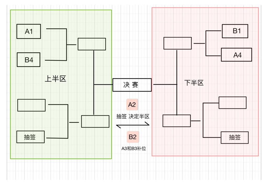 淘汰赛分为上、下半区,A组第一、B组第四自动进入上半区,并分到一个小组进行交叉赛;B组第一、A组第四自动进入下半区,并分到一个小组进行交叉赛;A、B组第二名队伍分别进行抽签决定进入上、下半区,A、B组第三名队伍自动补位进入上、下半区(同一小组队伍淘汰赛不再进行交手,即不可能分到一个小组进行交叉赛)。