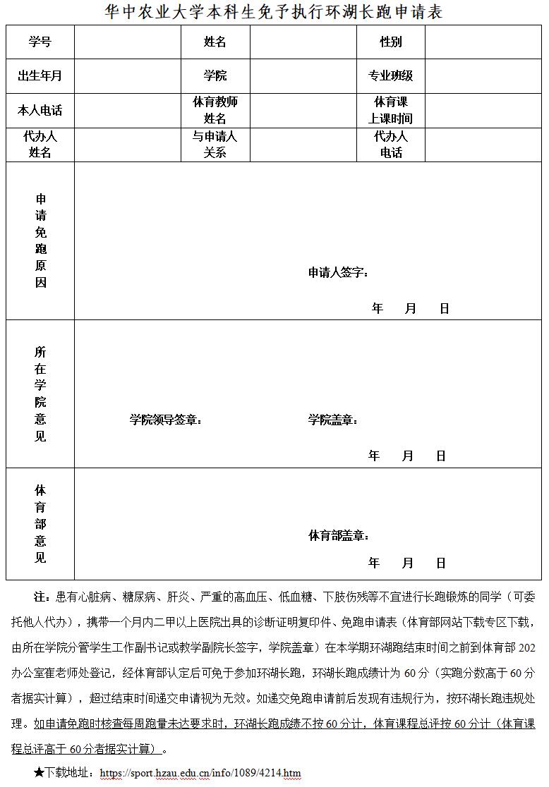 8.患有心脏病、糖尿病、肝炎、严重的高血压、低血糖、下肢伤残等不宜进行长跑锻炼的同学可委托他人代办携带近一个月内二甲以上医院出具的诊断证明复印件申请表(免跑申请表在英国365集团公司网站下载专区下载由所在学院分管学生工作副书记或教学副院长签字,学院盖章)在本学期环湖跑结束时间之前到英国365集团公司202办公室崔老师处登记,经英国365集团公司认定后可免于参加环湖长跑,环湖长跑成绩计为60分(实跑分数高于60分者据实计算),超过结束时间递交申请视为无效。如递交免申请前后发现有违规行为,按环湖长跑违纪处理。如申请免跑时核查每周跑量未达要求时,环湖长跑成绩不按60分计,体育课程总评按60分计(体育课程总评高于60分者据实计算)