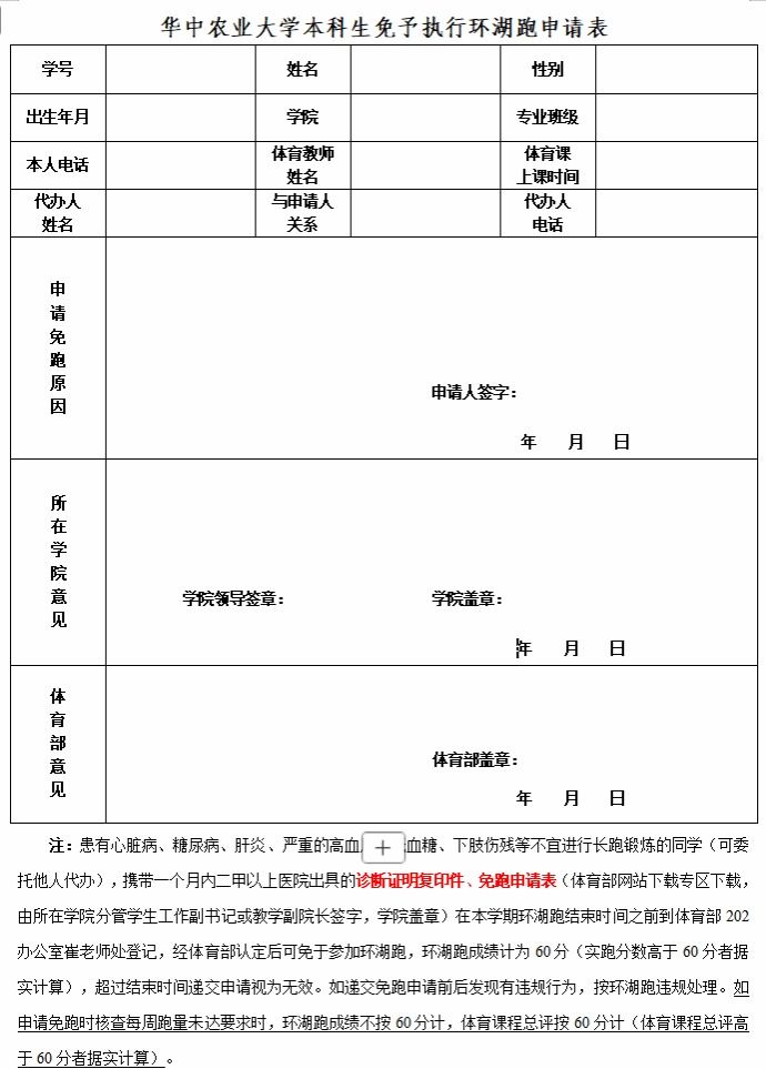 7.患有心脏病、糖尿病、肝炎、严重的高血压、低血糖、下肢伤残等不宜进行长跑锻炼的同学(可委托他人代办),携带近一个月内二甲以上医院出具的诊断证明复印件、免跑申请表(免跑申请表在英国365集团公司网站下载专区下载/info/1089/4214.htm,由所在学院分管学生工作副书记或教学副院长签字,学院盖章)在本学期环湖跑结束时间之前到英国365集团公司202办公室崔老师处登记,经英国365集团公司认定后可免于参加环湖跑,环湖跑成绩计为60分(实跑分数高于60分者据实计算),超过结束时间递交申请视为无效。