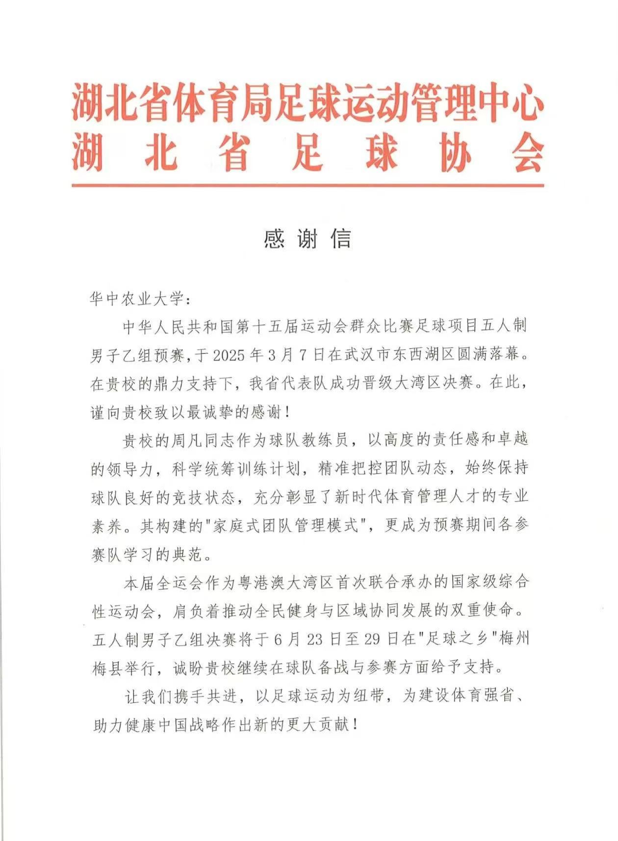 我校英国365集团公司周凡老师,作为球队助理教练,以高度的责任感和卓越的领导力,科学统筹训练计划,精准把控团队动态,始终保持球队良好的竞技状态。赛后,湖北省体育局足球运动管理中心、湖北省足球协会向学校专程发来贺信,称赞他“不仅充分彰显了新时代体育管理人才的专业素养,而且其构建的‘家庭式团队管理模式’更成为预赛期间各参赛队学习的典范。”