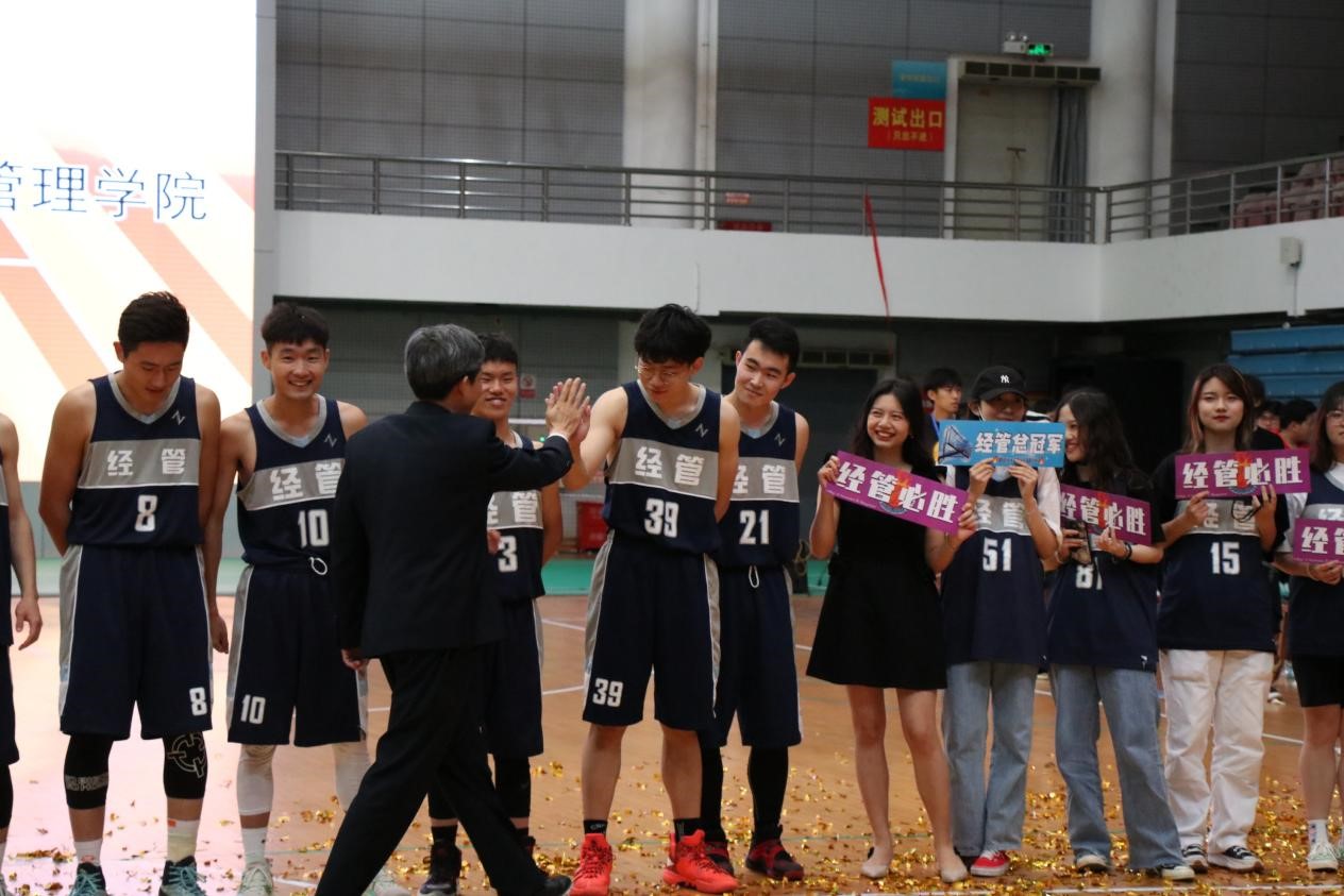 图为高翅书记与经管男篮球员击掌